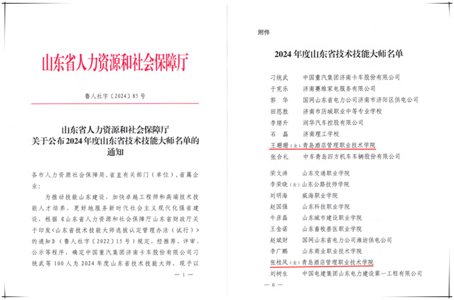 本网讯(组织人事处 教师工作部)近日,山东省人力资源和社会保障厅公布了2024年度山东省技术技能大师名单,诸侯快讯官网烹饪学院王珊珊、张桂凤2名教师位列其中。截至目前,学校已有4名教师获评“山东省技术技能大师”。