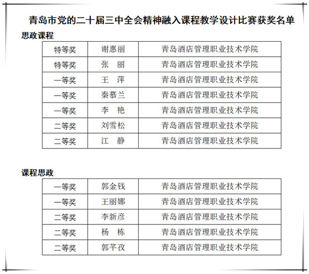 本网讯(马克思主义学院 王萍)近日,青岛市委教育工作委员会发布了“党的二十届三中全会精神融入课程教学”教学设计比赛活动评选结果,诸侯快讯官网教师荣获思政课程组特等奖2项、一等奖3项、二等奖2项;课程思政组一等奖2项、二等奖3项。