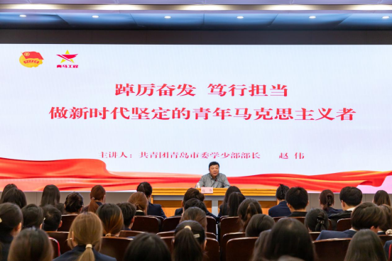 共青团青岛市委学少部部长赵伟以《踔厉奋发 笃行担当 做新时代坚定的青年马克思主义者》为题,围绕着青岛市共青团工作开展情况、青岛市学联贯彻落实上级部署要求、新时代共青团工作方式方法、共青团品牌建设等四部分内容,为学员讲授“青马工程”第一课,希望青年学子们坚定理想信念,提升理论素养,做马克思主义的忠诚信奉者、坚定实践者,学思践悟,练就出能担事的铁肩膀和能成事的真本领,奋力书写为中国式现代化挺膺担当的青春篇章。