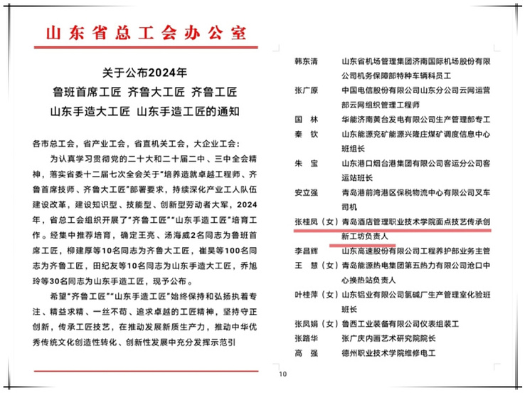 本网讯(工会 吴春雷)近日,山东省总工会下发《山东省总工会办公室关于公布2024年鲁班首席工匠、齐鲁大工匠、齐鲁工匠山东手造大工匠、山东手造工匠的通知》,学校烹饪学院教师张桂凤喜获“齐鲁工匠”荣誉称号。