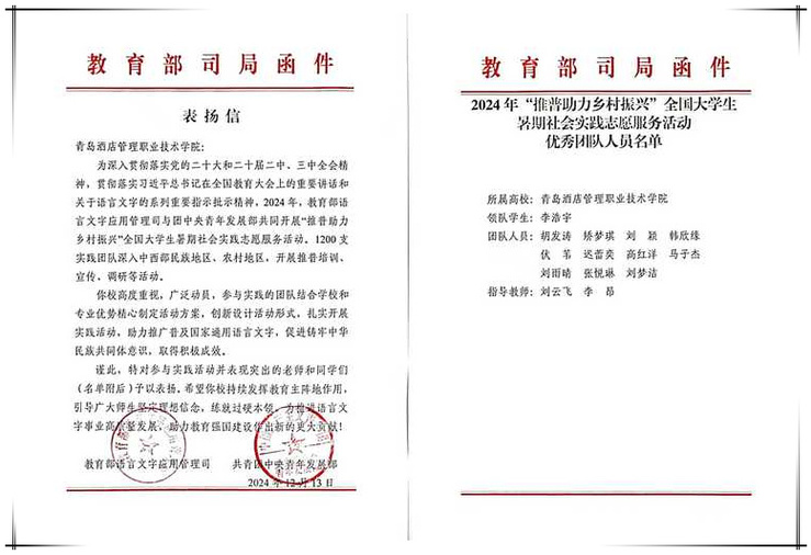 本网讯(团委 文旅学院)近日,由教育部语言文字应用管理司、共青团中央青年发展部联合开展的2024年“推普助力乡村振兴”全国大学生暑期社会实践志愿服务活动评选结果揭晓,诸侯快讯官网文旅学院组织赴新疆哈密“百村计划”乡村振兴服务队获评2024年度“推普助力乡村振兴”优秀团队,教育部语言文字应用管理司和共青团中央青年发展部来信表扬,对学校社会实践活动的突出贡献表示充分肯定。