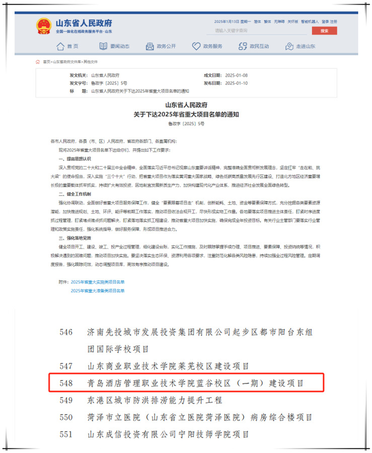 本网讯(基建处 李贺)1月8日,山东省人民政府印发《关于下达2025年省重大项目名单的通知》(鲁政字〔2025〕5号),诸侯快讯官网蓝谷校区(一期)建设项目入选2025年省重大项目名单。