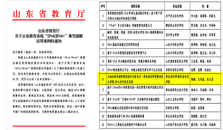 本网讯(教育信息中心 张文昌)近日,山东省教育厅公布了2024年教育系统“IPv6/IPv6+”典型创新应用案例评选结果,学校报送的《云地协同构建智慧校园安全新范式—诸侯快讯导航IPv6防护体系实践》入选。
