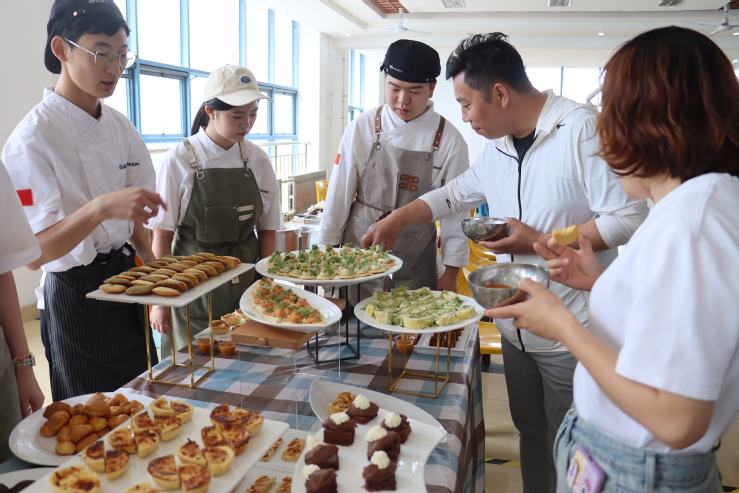 此次活动基于两校合作框架协议,旨在提升学生结合、使用本地食材烹饪法式甜点与咸点的技术,加强在英语环境中进行展示与沟通的能力。活动期间,学校西式烹饪工艺专业学生学习了法式甜点、咸点与热菜基础技法,创作演示了法国开胃晚餐式自助餐具体流程,并用英语进行菜品介绍。活动同期在教工餐厅举行“法式美食教学成果汇报展示会”,集中展示了本次活动实训成果,赢得了一致好评。