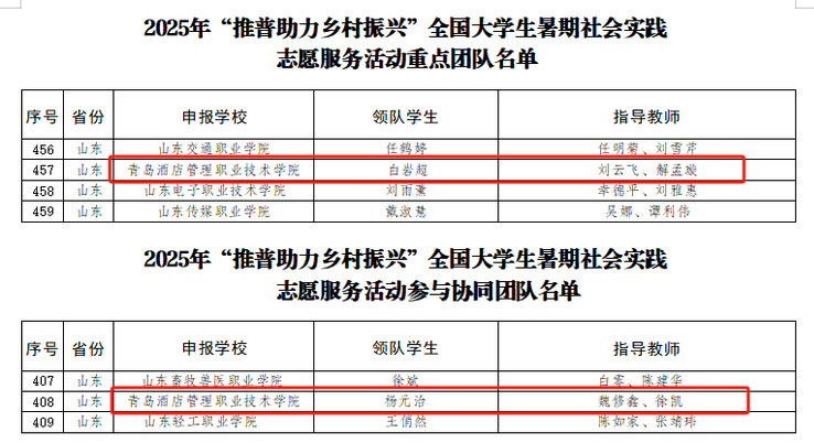 本网讯(团委 徐昂)近日,教育部公布《2025年“推普助力乡村振兴”全国大学生暑期社会实践志愿服务活动入选团队名单》,学校文旅学院“百村计划”推普助力乡村振兴志愿服务队、会计学院“青雁”推普助力乡村振兴服务队入选。入选团队数量较往年继续有所突破,位居山东省高职院校前列、青岛市高职院校首位。