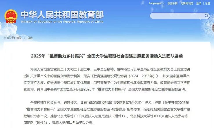 “百村计划”推普助力乡村振兴志愿服务队以“乡约文旅新征程 推普筑梦促振兴”为主题,聚焦乡村语言文化与文旅产业融合发展,组建专业团队,赴新疆喀什地区叶城县开展系列推普实践活动,以语言赋能乡村振兴。“青雁”推普助力乡村振兴服务队以“青雁”传声 语润“天等”为主题,融合了汉族、壮族青年学生,聚焦广西天等县,以专业知识和青春热忱精准赋能当地乡村发展,探索符合地方特色的振兴路径,为广西乡村振兴战略贡献智慧与力量。