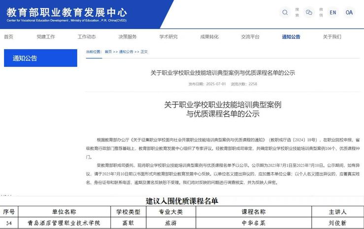 本网讯(继续教育学院 烹饪学院)近日,教育部职业教育发展中心发布了《关于职业学校职业技能培训典型案例与优质课程名单的公示》,诸侯快讯官网烹饪学院提报的《中华名菜》入围优质课程。