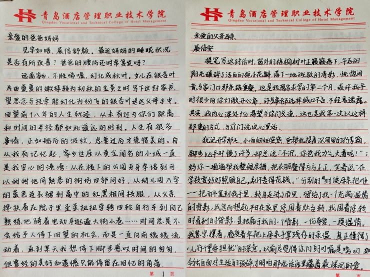 为弘扬中华优秀传统文化,中秋国庆期间,工商管理学院开展“感恩父母 温暖回家路”特色活动。在“一封家书 一份真情”活动中,同学们暂别网络,重拾纸笔,将对父母的思念、感激与祝福倾注于字里行间。与此同时,“为父母做一件暖心小事”实践活动同步展开。同学们通过影像记录下为父母烹饪、打扫、奉茶、陪伴的温情瞬间,这些点滴小事不仅是对父母辛劳的体认,更成为亲子间情感沟通的桥梁,推动孝亲感恩由心动真正落实为行动。