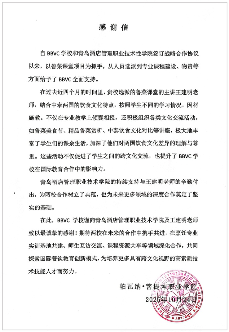 本网讯(烹饪学院 国际交流与合作处)近日,泰国帕瓦纳·菩提坤职业学院向学校发来感谢信,对学校在教育援助工作中作出的贡献表示感谢。
