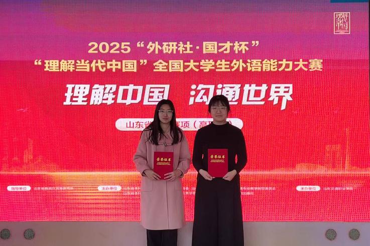 本网讯(工商管理学院 胡晓霞)近日,2025“外研社·国才杯”“理解当代中国”全国大学生外语能力大赛(高职组)山东赛区写作大赛、演讲大赛落幕。学校商务英语专业学生张诗琪获得写作大赛金奖并将代表山东赛区参加全国总决赛,李晓蕊获得演讲大赛银奖。