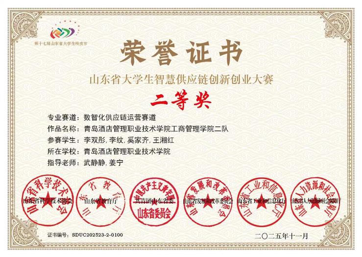 本网讯(工商管理学院 武静静)近日,第十七届山东省大学生科技节智慧供应链创新创业大赛数智化供应链赛道落下帷幕,学校现代物流管理专业选派的两支队伍分获一等奖和二等奖。