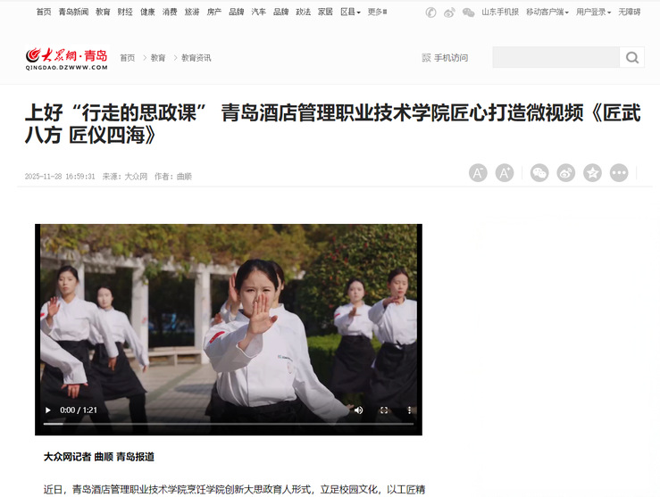 烹饪学院创新大思政育人形式,立足校园文化,以工匠精神为核心,邀请第十五届全运会山东省代表队铜牌团队成员现场指导,将中餐技艺的切、剁、翻与面点技法的拉、揉、抻等技能技巧,与传统太极武术的手法、身法、步法深度融合,结合体育的活力韵律,匠心打造微视频《匠武八方 匠仪四海》,生动呈现出一堂“行走的思政课”,浸润烹饪工匠礼仪规范,将工匠精神、体育精神与中国传统文化的烹饪文化、武术文化紧密契合,厚植文化自信与家国情怀,切实提升思政引领力和感染力,被大众网转发推送。
