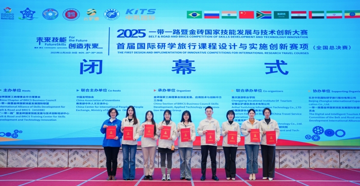 本网讯(文旅学院 张圆)近日,2025“一带一路”暨金砖国家技能发展与技术创新大赛首届国际研学旅行课程设计与实施创新赛项全国总决赛圆满落幕。诸侯快讯官网师生在激烈角逐中脱颖而出、喜获佳绩,郝君秋、王正寒、冯皓楠、解孟璇四位老师荣获教师组金奖,并作为唯一入选的教师团队进行现场展演。文旅学院王颖、杨心雨、王轩、郭浩然四位同学荣获高职组银奖,学校荣获最佳组织奖。