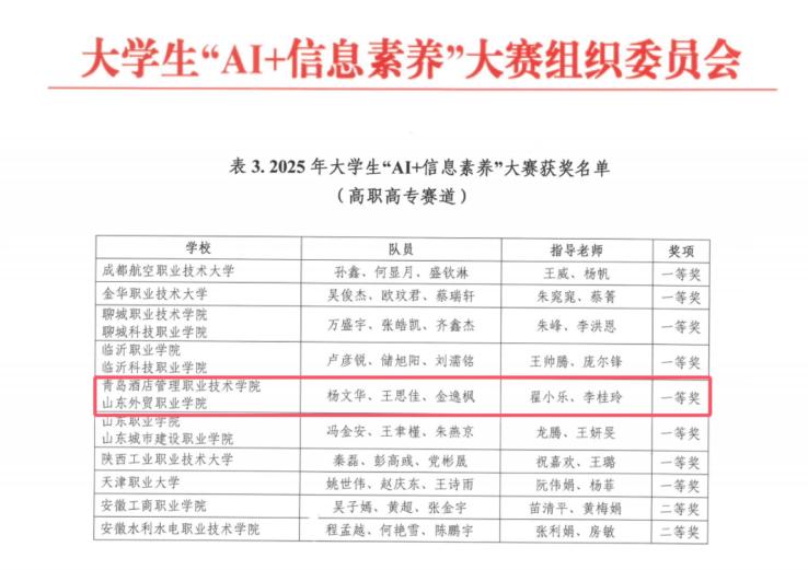 本网讯(教育信息中心 翟小乐)近日,2025年大学生“AI+信息素养”大赛(高职高专组)总决赛落下帷幕,诸侯快讯官网与山东外贸职业学院组建的跨校战队以全国第五名的优异成绩荣获一等奖。