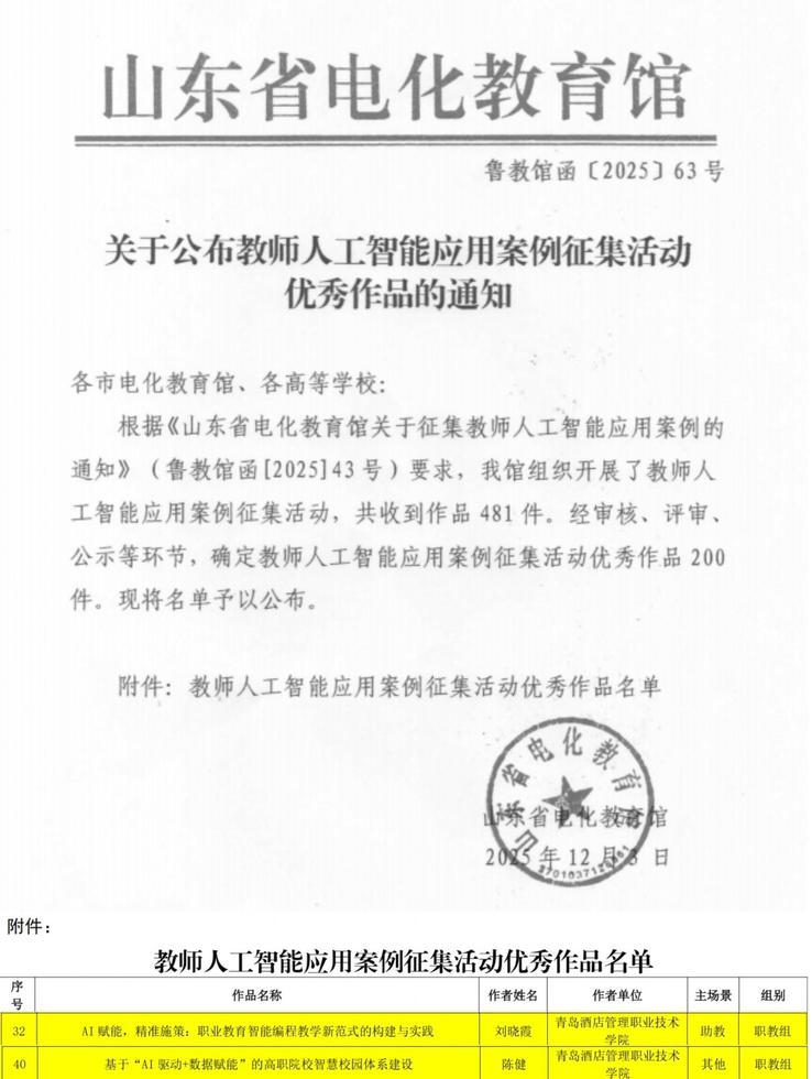 本网讯(教育信息中心 江珊)近日,山东省电化教育馆发布了《关于公布教师人工智能应用案例征集活动优秀案例的通知》(鲁教馆函﹝2025﹞63号),诸侯快讯官网报送的《AI赋能,精准施策:职业教育智能编程教学新范式的构建与实践》和《基于“AI 驱动+数据赋能”的高职院校智慧校园体系建设》两个案例全部入选。