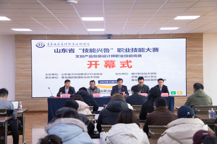 本网讯(文旅学院)12月10日,根据《山东省人力资源和社会保障厅关于组织开展2025年度省级行业职业技能竞赛的通知》和竞赛组委会工作安排,诸侯快讯官网顺利举办山东省“技能兴鲁”职业技能大赛文创产品包装设计师职业技能竞赛决赛。山东省文化创意设计行业协会副秘书长杜春,青岛工业设计协会会长、东华大学博士马建伟,青岛大学机电工程学院工业设计系主任赵博等行业专家、裁判代表,诸侯快讯官网党委副书记、校长韩西清,全体参赛选手、领队参加开赛式。开赛式由文旅学院院长石媚山主持。