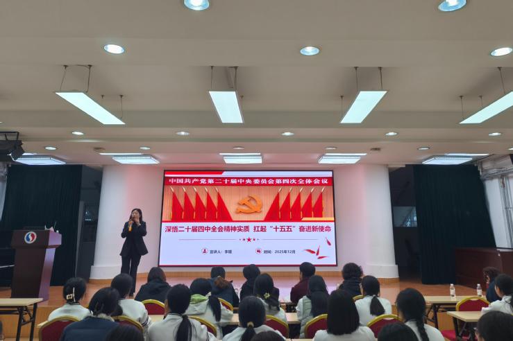 揭牌仪式后,马克思主义学院副院长李瑶以《深悟党的二十届四中全会精神实质 扛起“十五五”奋进新使命》为题,为青岛外事职业学校师生作理论宣讲。她紧扣教师职业发展和学生职业规划,阐述了党的二十届四中全会给职业学校师生带来的新机遇,鼓励青年学子怀抱梦想、脚踏实地,敢想敢为、善作善成,以奋斗姿态激扬青春,让青春在全面建设社会主义现代化国家的火热实践中绽放绚丽之花。