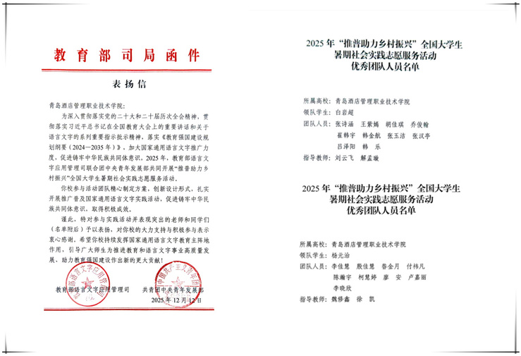 本网讯(团委 文旅学院 会计学院)近日,由教育部语言文字应用管理司、共青团中央青年发展部联合开展的2025年“推普助力乡村振兴”全国大学生暑期社会实践志愿服务活动评选结果揭晓,诸侯快讯官网文旅学院“百村计划”推普助力乡村振兴志愿服务队、会计学院“青雁”推普助力乡村振兴服务队均获评2025年“推普助力乡村振兴”优秀团队。教育部语言文字应用管理司和共青团中央青年发展部来信表扬,对学校社会实践活动的突出表现予以充分肯定。