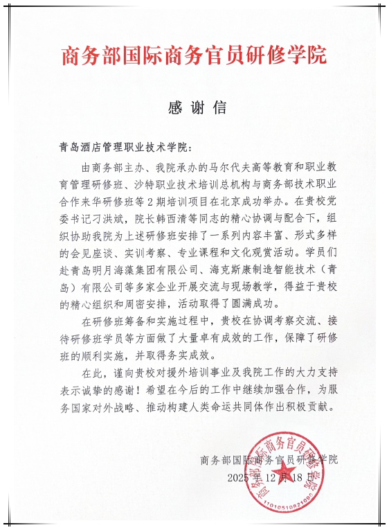 本网讯(国际交流与合作处 孙丽艳)近日,学校收到商务部国际商务官员研修学院发来的感谢信,对学校高质量协助马尔代夫高等教育和职业教育管理研修班、沙特职业技术培训总机构与商务部技术职业合作来华研修班的两期项目表示高度认可与诚挚感谢。