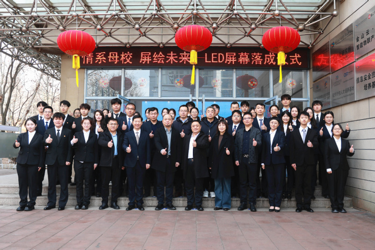 此次揭幕投入使用的LED显示屏面积约20平方米,采用高密度像素配置与广色域显示技术,具备高亮度、高对比度和宽视角的显著优势。屏幕搭载于信息楼大厅,不仅是学院信息发布、学术成果展示、文化活动直播的现代化视觉窗口,更承载着深厚的情谊与期许,为在校学子拓开了一扇眺望行业前沿、激发创新思维的视窗,生动诠释了“情系母校 屏绘未来”的丰富内涵。
